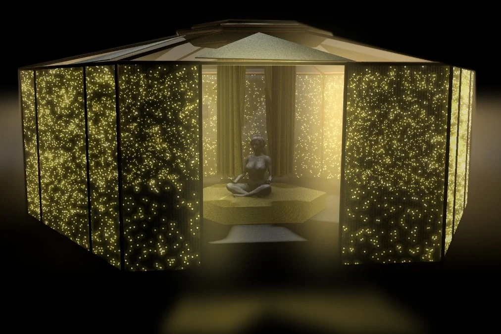 A sanctuary dedicated to experiencing the phenomena of sympathetic resonance. Walls made of piano harps surround the participant with 20,000 musical strings that echo back every sound. Strings are tuned to pentatonic scales based on the Schumann Resonance, the earth's fundamental frequency.