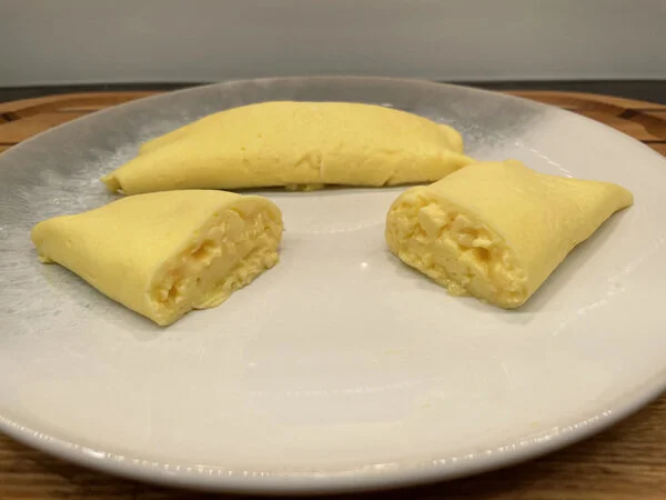 The omelette had a mild egg aroma, with no discernible smell of butter or any browning. The texture was delicate, with an extremely soft (almost silky) outer layer, and moist overall texture, similar to a soufflé. It had a bit of a bounce to the touch. The taste was creamy and had a delicate mouthfeel.