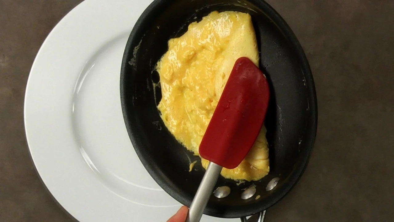 Once ready for rolling, I positioned the pan above the plate, and folded over the top third (parallel to the handle). I then ran my spatula around the edge of the omelette, and gave the pan a gentl…